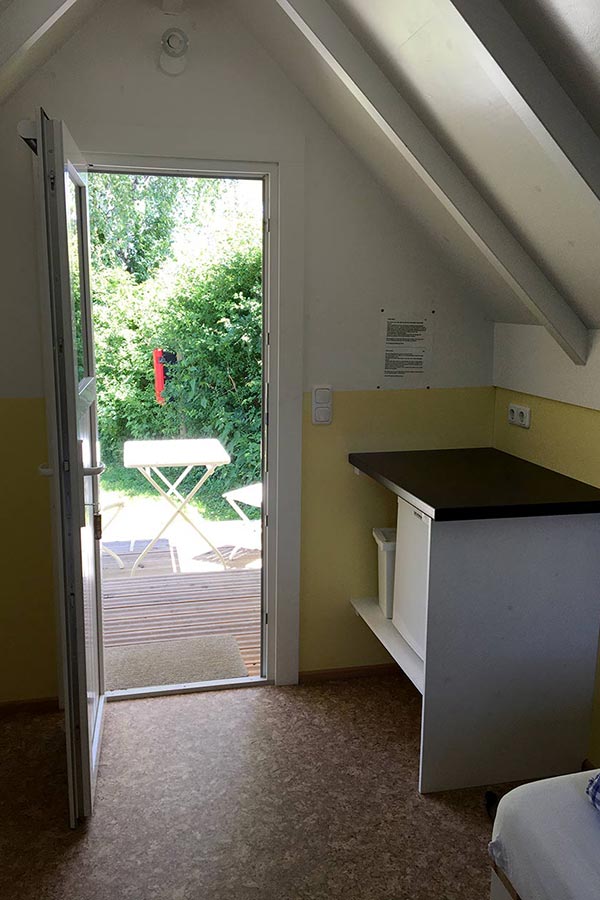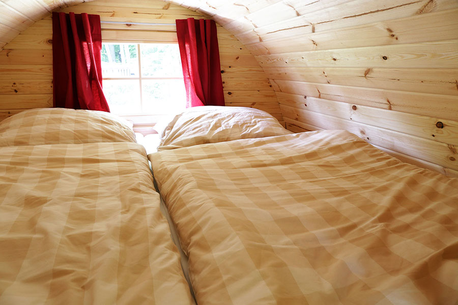 Die Hütten sind gut isoliert und mit Strom, Licht und einer Elektroheizung ausgestattet. Zwei Einzelbetten (80 × 200 cm) mit Matratzen stehen zur Verfügung und können bei Bedarf zusammengeschoben werden. Eine kleine Küchenablage mit Hotelkühlschrank sowie eine überdachte Terrasse laden zum Verweilen ein – perfekt, um den Abend ruhig ausklingen zu lassen.